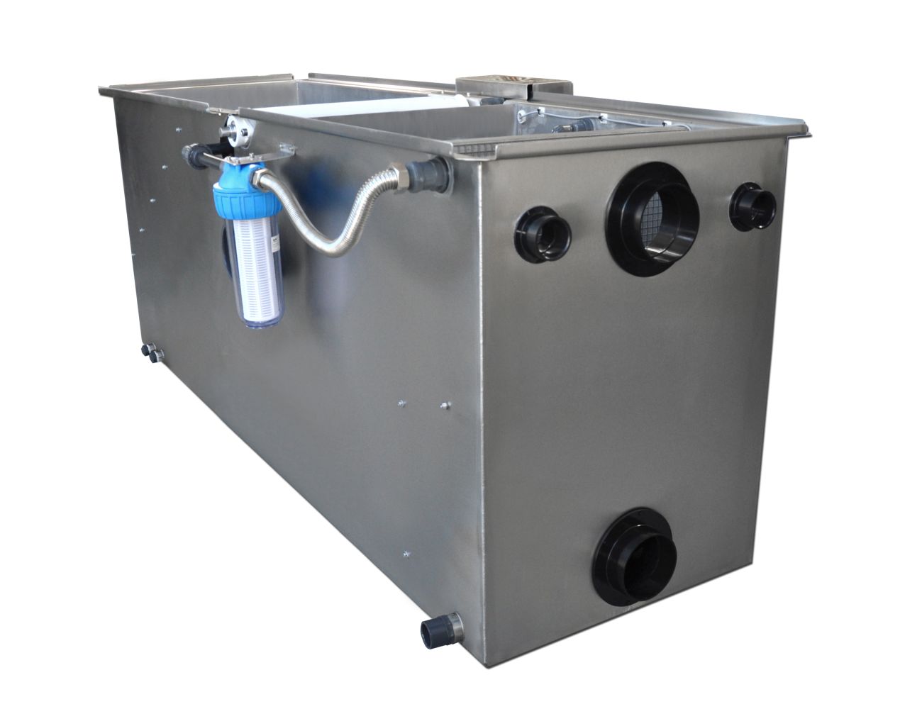 Des Weiteren ist die Biokammer mit einer notwenigen Bio-Sperre (V2A Lochblech) ausgestattet. Somit wird das Biomedium (welches nicht im Lieferumfang enthalten ist) daran gehindert, in den Teich zu gelangen oder die Funktionalität des Filterbands zu beinträchtigen. Die Teichpumpen sind daher vom Biomedium getrennt und eine einfache Wartung / ein Austausch der Pumpentechnik ist jederzeit problemlos möglich. Auf diese Weise ist die Biokammer integriert, jedoch trotzdem autark.