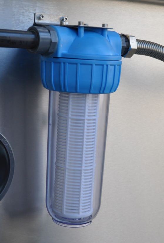 Die Spülpumpe ist in der letzten Kammer untergebracht und sorgt über die Zuleitung des Panzerschlauchs für eine zuverlässige Versorgung des Düsenstocks, welcher das Filterband mit einem Druck von ca. 4Bar von Schmutzpartikeln befreit. Die abgespülten Partikel werden über eine Ablaufrinne mit einem starkem Gefälle direkt in den Kanal abgeleitet.