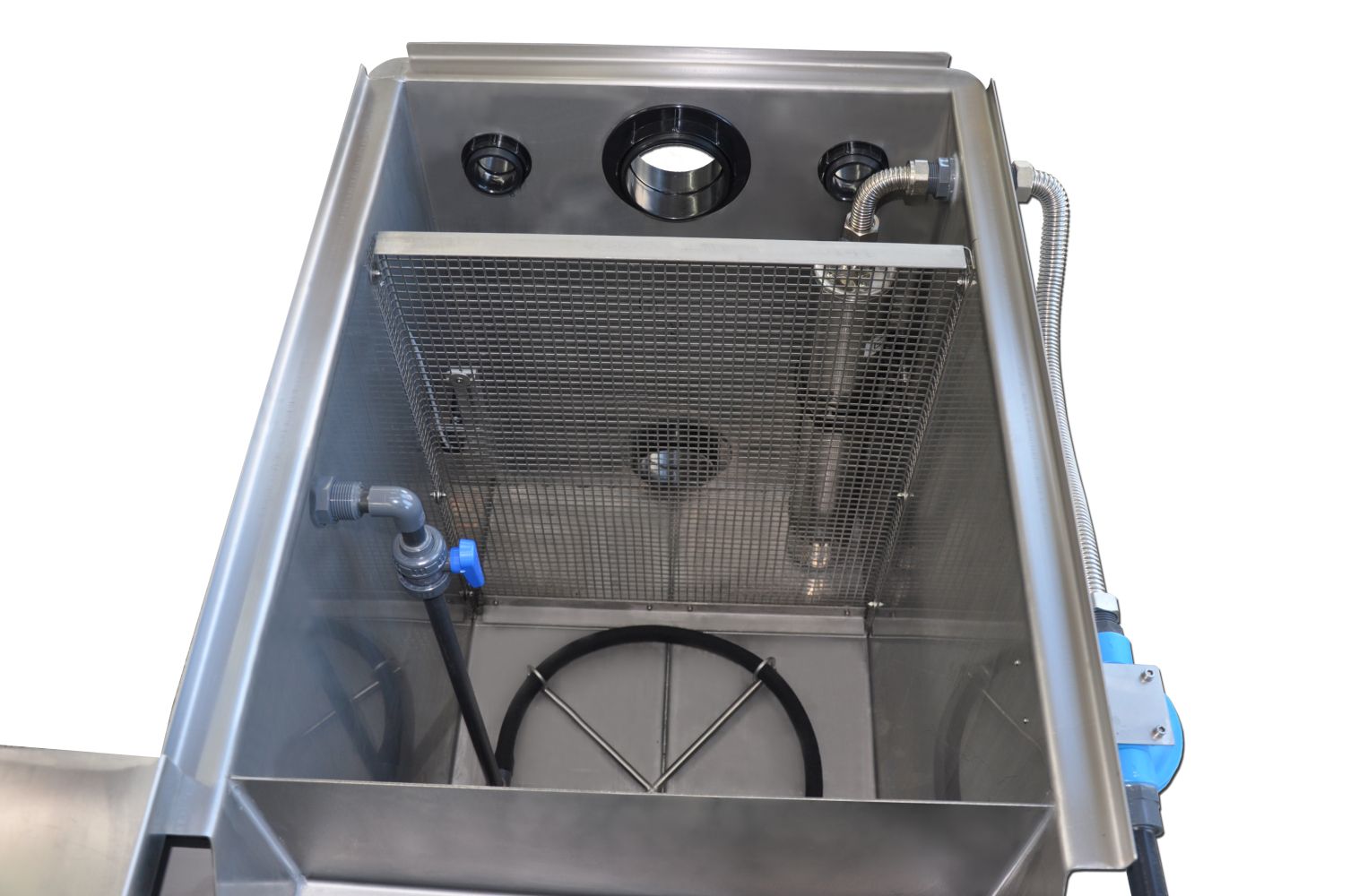 Die Spülpumpe ist in der letzten Kammer untergebracht und sorgt über die Zuleitung des Panzerschlauchs für eine zuverlässige Versorgung des Düsenstocks, welcher das Filterband mit einem Druck von ca. 4Bar von Schmutzpartikeln befreit. Die abgespülten Partikel werden über eine Ablaufrinne mit einem starkem Gefälle direkt in den Kanal abgeleitet.