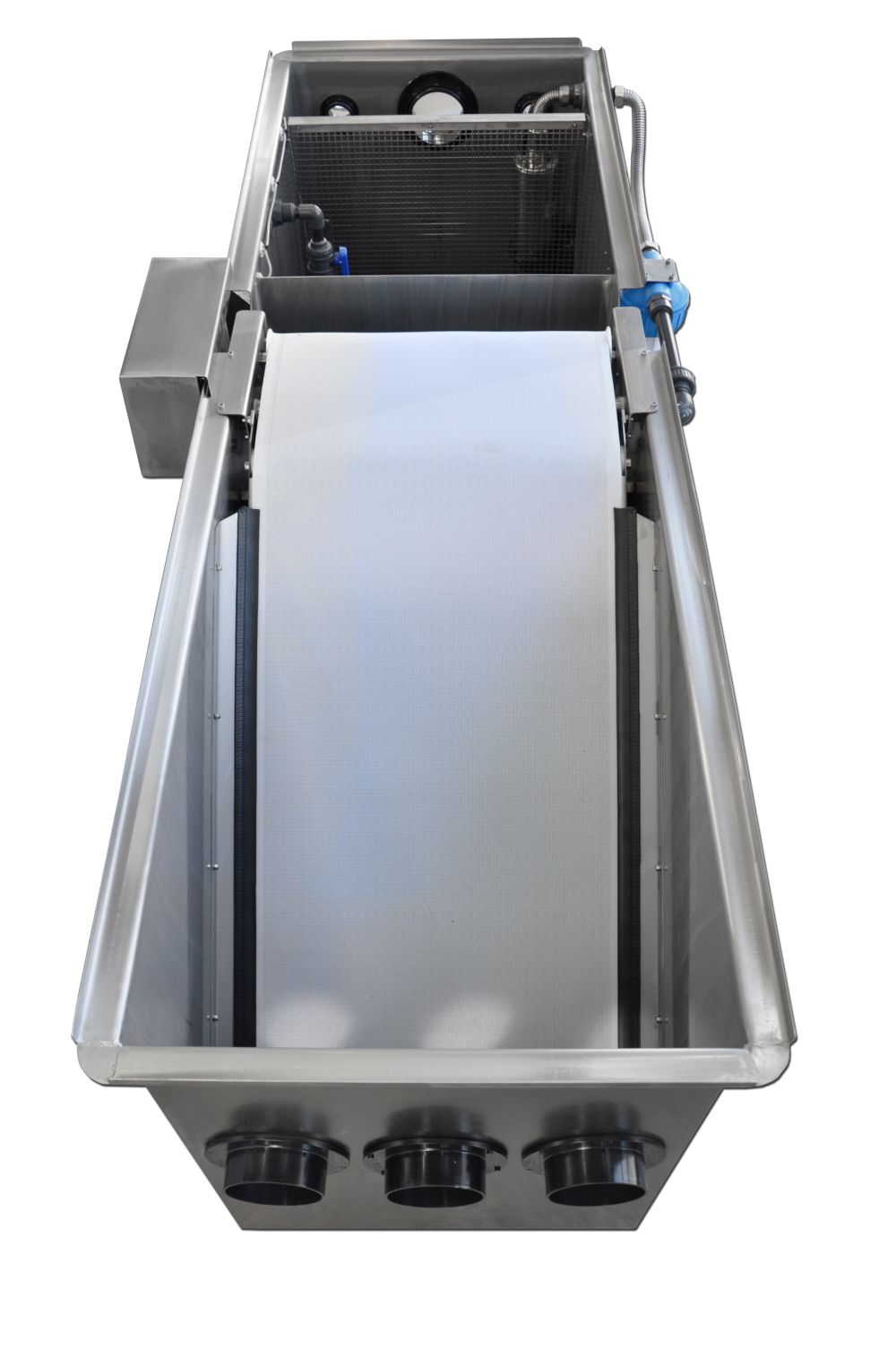 · Das Wasser durchströmt nun das Hochdurchsatzband. Das Band erlaubt eine erste Filterung von groben Schmutzpartikeln und Feinfilterung von Partikeln mit einer Größe von bis zu 75μ aus dem Wasser. Auf diese Weise werden grobe Schmutzpartikel von der Biomasse ferngehalten. Auf dem Band bildet sich zusätzlich ein so genannter Filterkuchen. Je dichter der Filterkuchen, desto feiner die Filterung. Da die Durchlässigkeit immer geringer wird, gelangen nur noch kleinere Partikel durch das Band.
