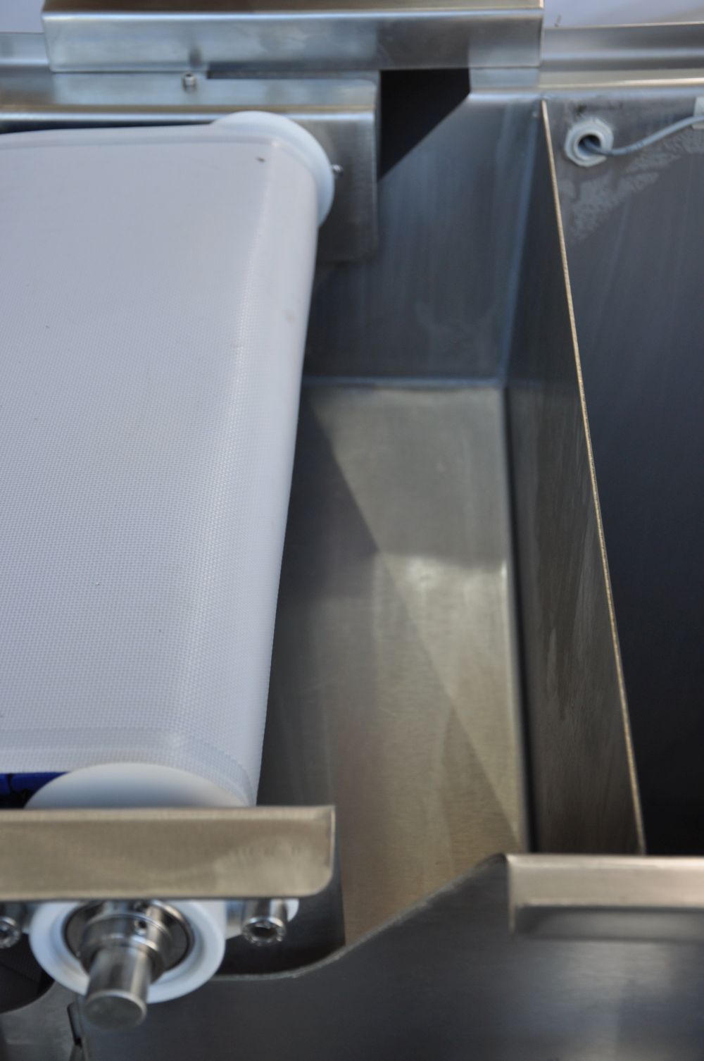 · Das Wasser durchströmt nun das Hochdurchsatzband. Das Band erlaubt eine erste Filterung von groben Schmutzpartikeln und Feinfilterung von Partikeln mit einer Größe von bis zu 75μ aus dem Wasser. Auf diese Weise werden grobe Schmutzpartikel von der Biomasse ferngehalten. Auf dem Band bildet sich zusätzlich ein so genannter Filterkuchen. Je dichter der Filterkuchen, desto feiner die Filterung. Da die Durchlässigkeit immer geringer wird, gelangen nur noch kleinere Partikel durch das Band.