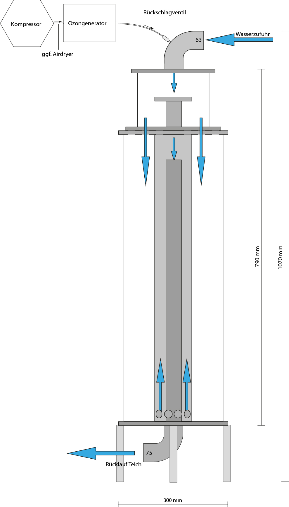 Durch eine zweifache Einmischung des Ozon-Luftgemisches und einem geringen Druckabfall ermöglichen alle Reaktoren einen hohen Wirkungsgrad der Ozoneinbringung bei geringem Druckverlust. Diese Reaktoren sind sowohl als Ozonreaktor als auch Sauerstoffreaktor zu verwenden. Es empfiehlt sich, die Generatoren über eine separate Pumpe zu betreiben oder diese, bei freien Kapazitäten, in die bestehende Pumpen- bzw. Rückleitung zum Teich zu integrieren. Das Ozon wird über einen Venturiinjektor im Inneren des Reaktors in das Wasser eingebracht. Dieser arbeitet ohne größere Strömungs- und Druckverluste und sorgt für eine optimale Blasenbildung im Reaktor.