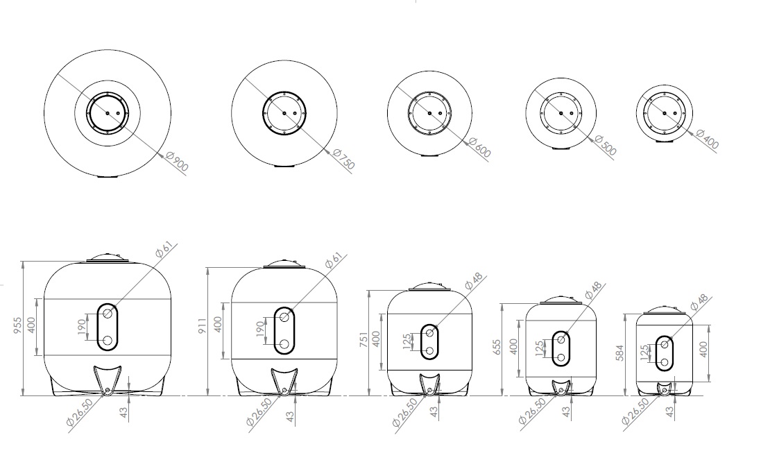 - Abmessungen: ca. 600 x 900 x 920mm (Ø x B x H) (B = inhl. 6-Wege Ventil, H = inkl. Blower)