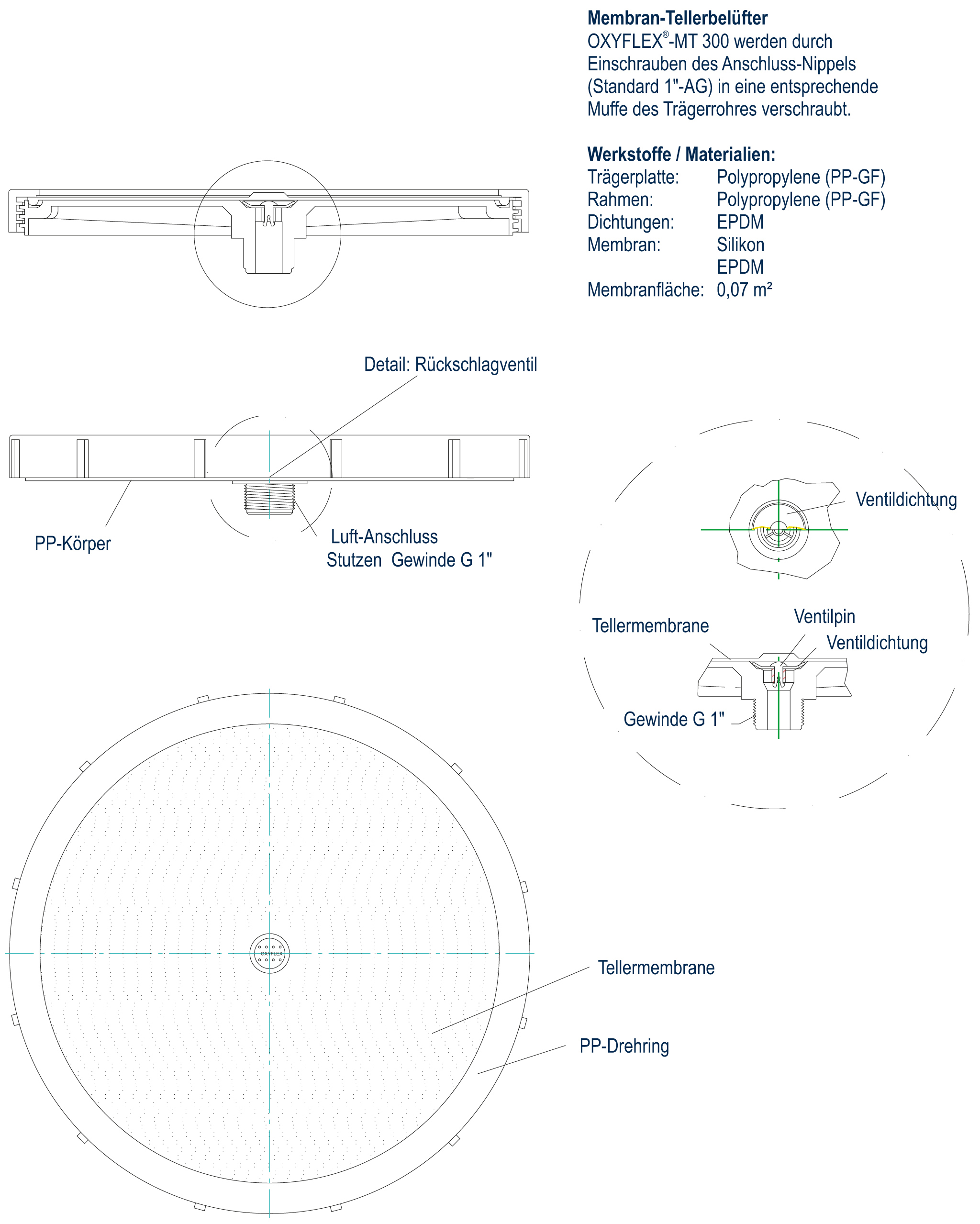 Die Trägerkonstruktion des Membran-Tellerbelüfters OXYFLEX MT bildet ein glasfaserverstärkter Polypropylen-Teller. Auf diesem Teller wird die Membran durch einen Kunststoffring aus glasfaserverstärktem Polypropylen formschlüssig befestigt.