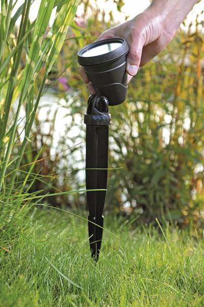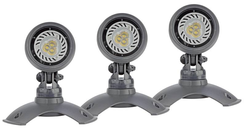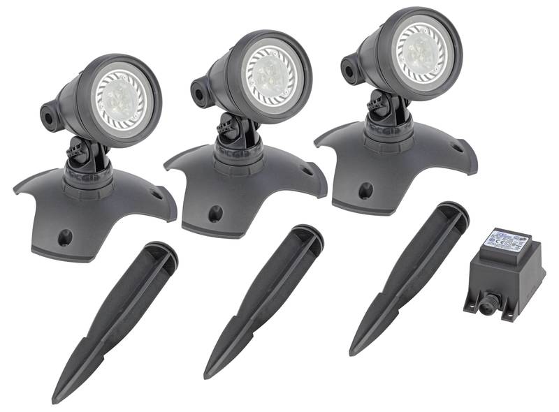 - Im Lieferumfang enthalten: 3 Scheinwerfer, Trafo 12 V, Gummischlauchleitung, 3 Erdspieße