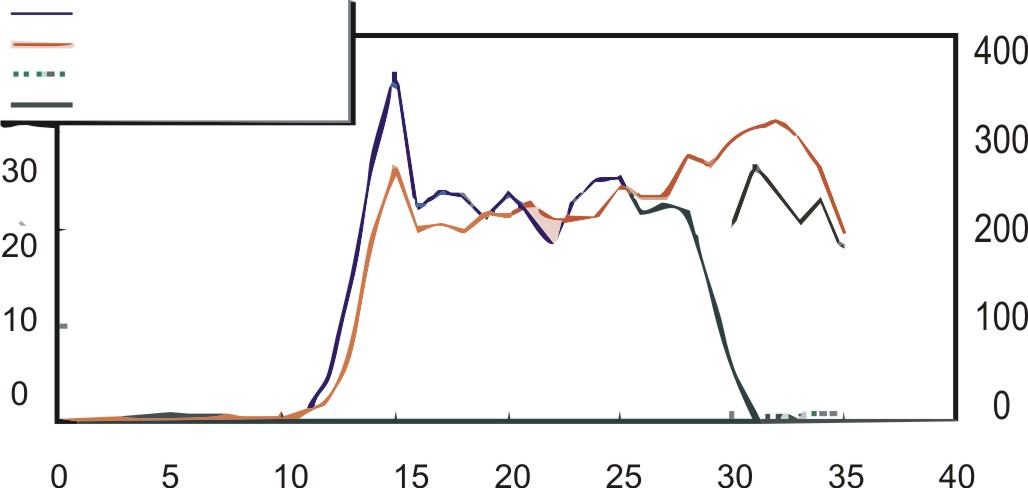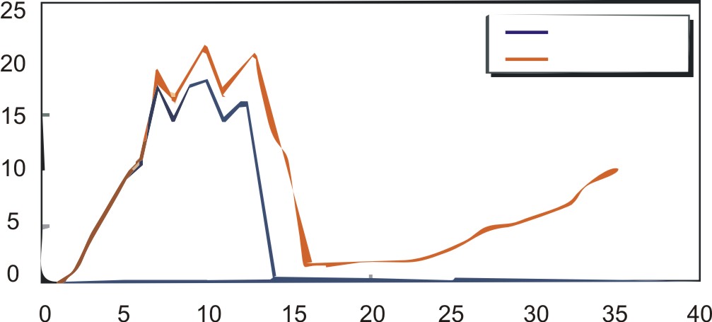 Die NO2-N Konzentration in dem Becken mit Crystal Bio steigt schneller und in höheren Mengen als in dem Becken mit einem herkömmlichen Kunststofffilter. Die Konzentration fällt plötzlich 28 Tage nach dem Beginn des Experiments. Die NO2-N Konzentration in dem Becken mit einem Kunststoffilter hingegen beginnt nach 33 Tagen. Die NO3-N Konzentration in dem Becken mit Crystal Bio bleibt unter 10mg/L wohingegen die im Becken mit einem Kunststofffilter zwischen 200 und 250mg/L bleibt. Das zeigt, dass die *Denitrifikation durch anaerobe Bakterien in Crystal Bio geschehen ist.