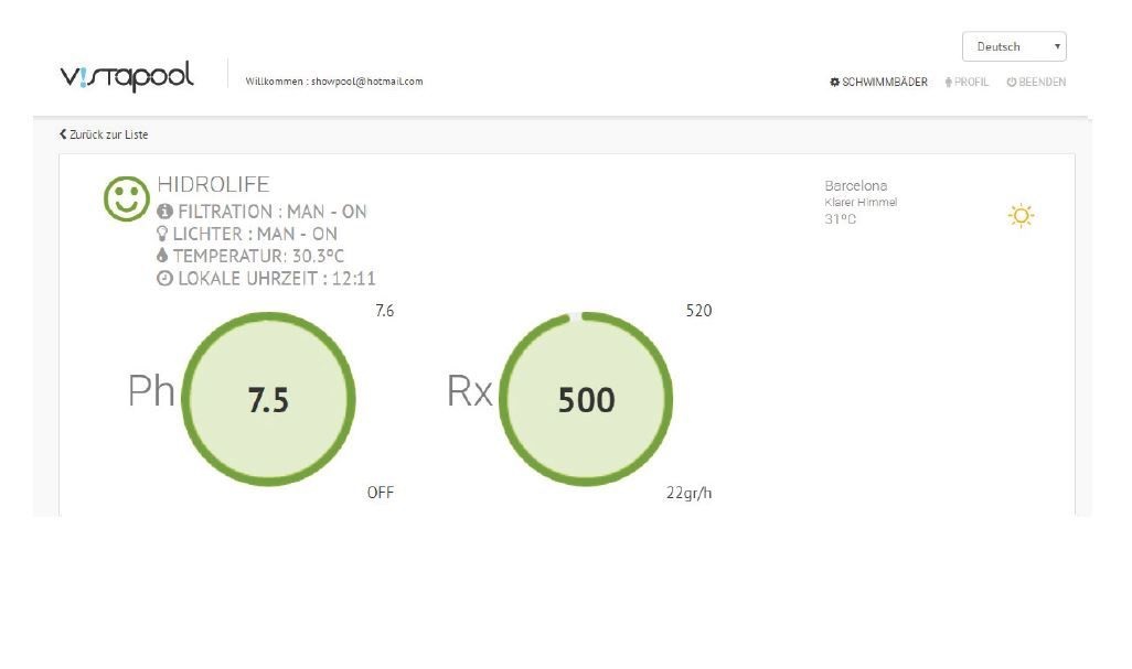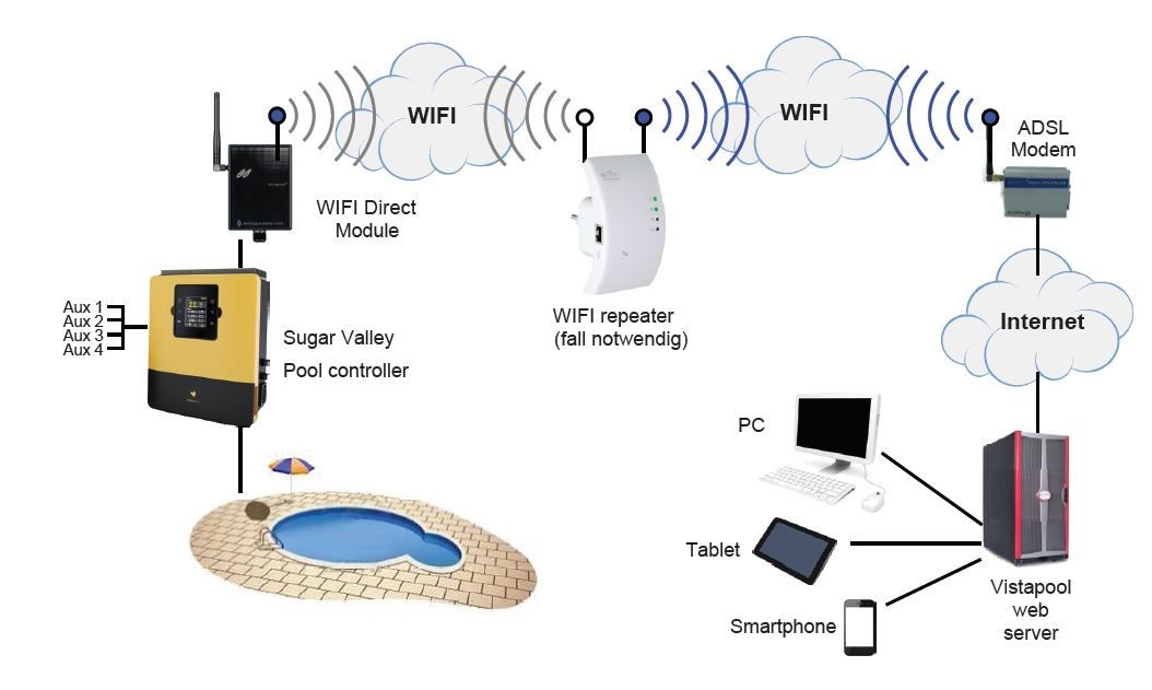 - Das Sugar Valley System kann über das Vistapool Control System mit einem Webbrowser auf dem PC, einem Tablet oder dem Smartphone bedient werden.